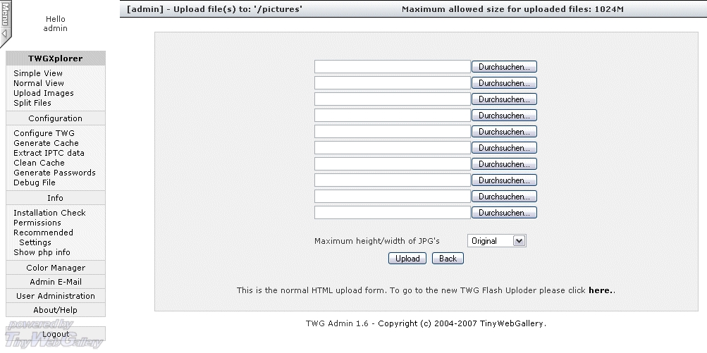 ZurückUser AdministrationColor managerFor registered user -  image folder overviewAdministration Help ScreenConfiguration HelperConfigurationInfo screenTFU File Split AppletTWGXplorerUpload - FrontendUpload - Html FormUpload - TWG Upload FlashUser AdministrationColor managerFor registered user -  image folder overviewAdministration Help ScreenConfiguration HelperConfigurationInfo screenTFU File Split Applet Vor